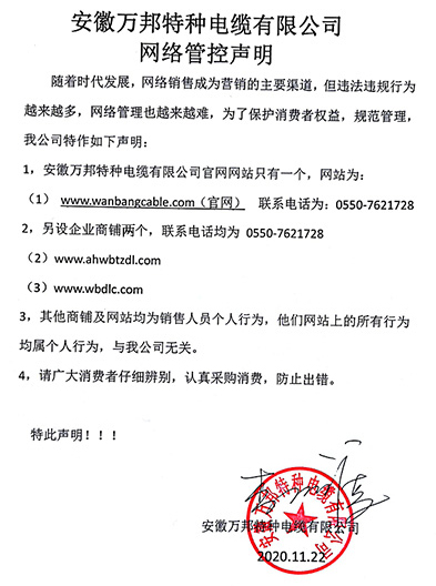 鄭重聲明:安徽萬邦特種電纜有限公司官方網站為:www_wanbangcable_com.flzpc.com,除此之外無任何子網站或合作網站,其余均為假冒偽劣。電話:0550-7621728 13485756353 地 址:安徽省天長市滁州高新技術產業開發區經四路29號